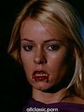 Secondly we see, as in Levres, Frederic releasing the four female vampires from their cemetery confinement. Now, however, after one of them has finished some rather strange masturbating on the coffin lid, the blonde, straying away from the others, suddenly enters through an apartment window and seduces an unsuspecting man in his bed while the thunder is roaring above. As she bites his neck we clearly sees her vampire fangs. This scene would actually work well in Levres as well.